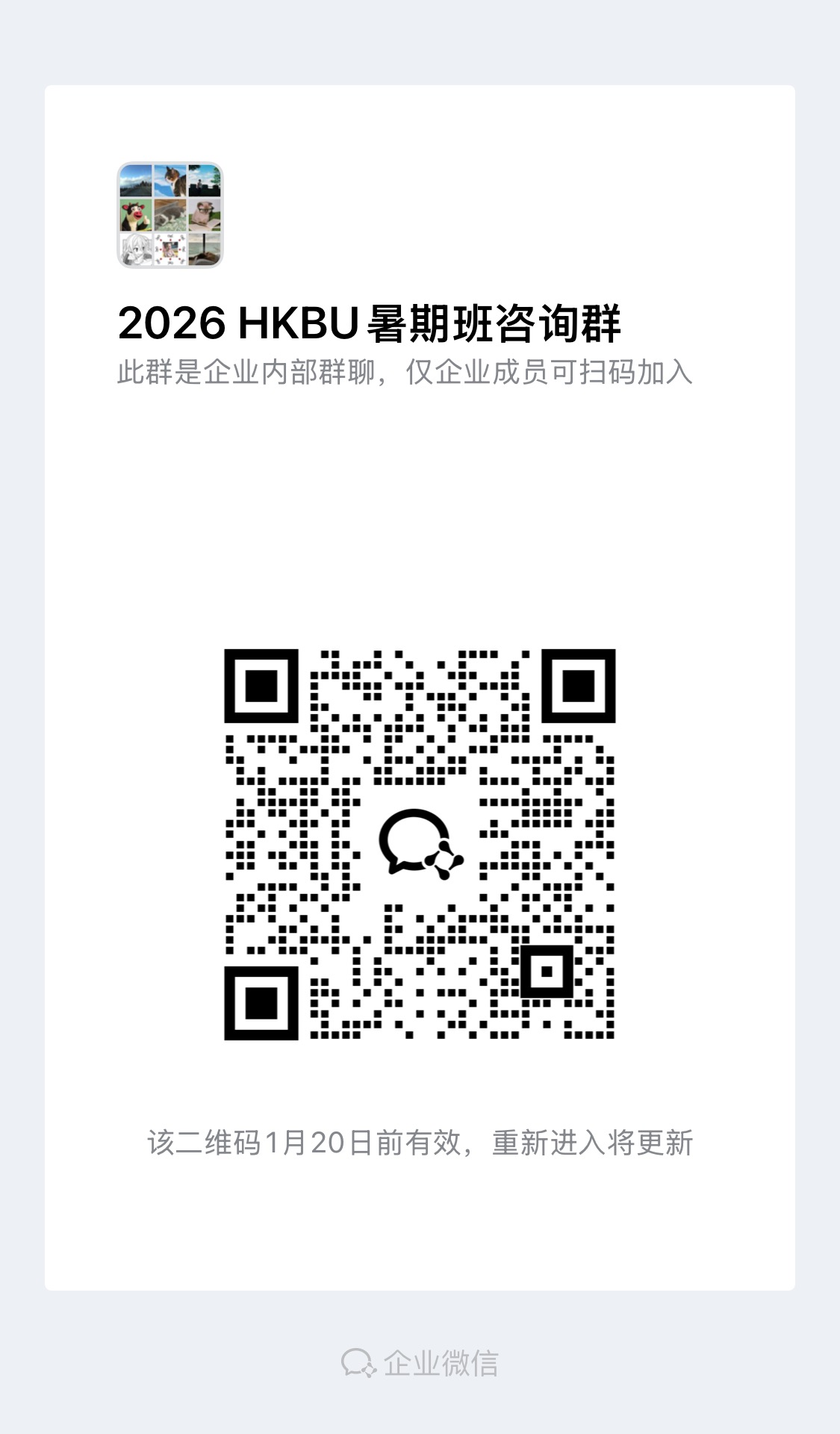咨询阶段(即日起):若有疑问,可扫码进入2026 HKBU暑期班咨询群,或联系Krystal 何老师(电话:0756-3677012,邮箱:hkbusp@bnbu.edu.cn)