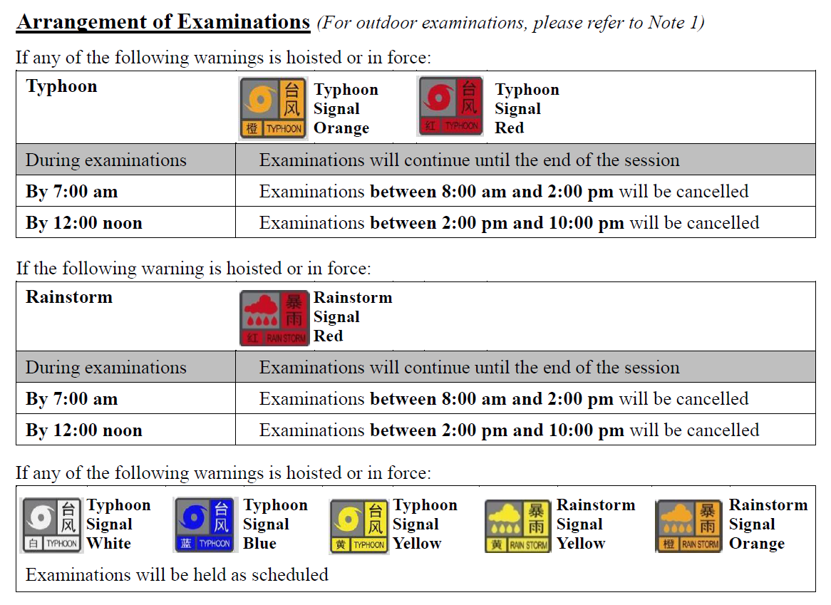 When Typhoon Signal Orange, Typhoon Signal Red or Rainstorm Signal Red is hoisted, all the outdoor teaching activities / examinations should be suspended immediately. The staff responsible should take all students to a safe place and make sure that it is safe for them to leave or return to campus.